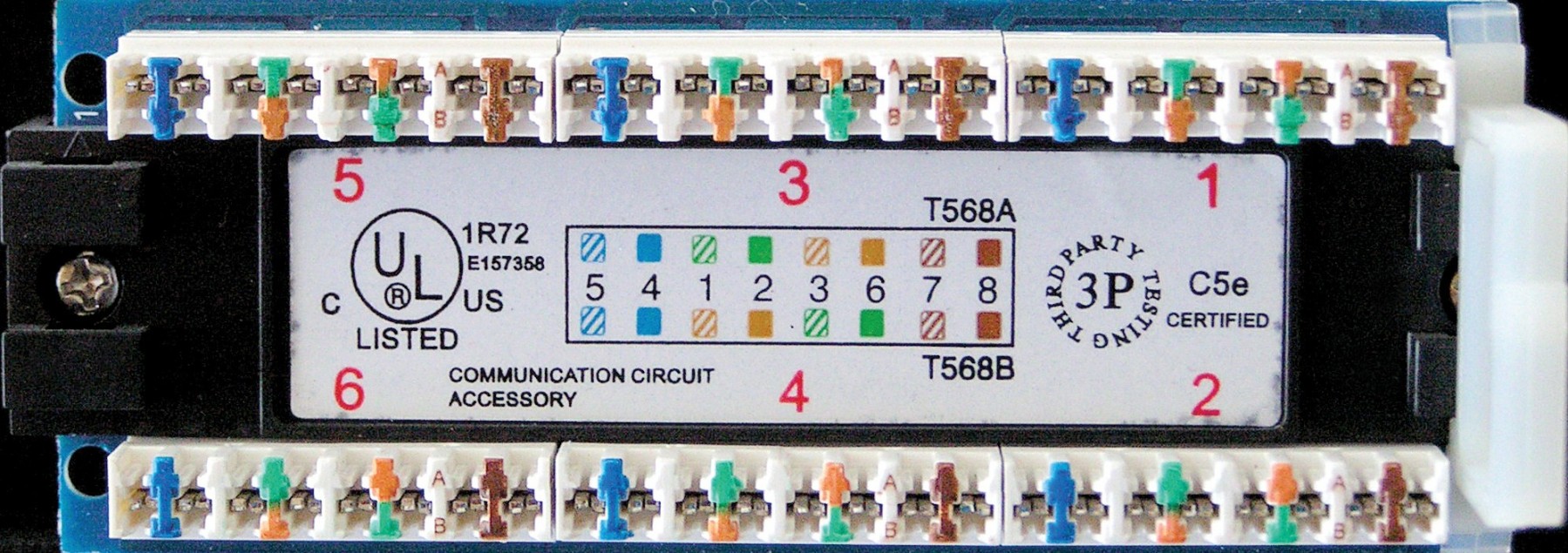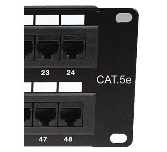 The category 5E Patch Panel is designed for high-density installations and exceeds ANSI/TIA/EIA-568 C.2 standards, accepts 22-26 AWG wires, and features phosphor bronze contacts. Patch panels are 19” horizontal rack mount compatible and are offered in 24, and 48 port configurations with built-in anchoring points for improved cable organization and security. Features color coded ports for universal wiring connections. A 110-type termination provides the most secure and reliable connection to maximize performance. Certified for safety by Underwriters Laboratories.